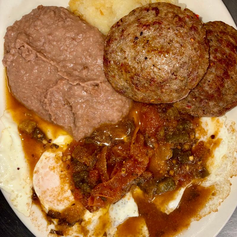 Two eggs scrambled mixed with Mexican sausage. Served with potatoes, beans and two tortillas.