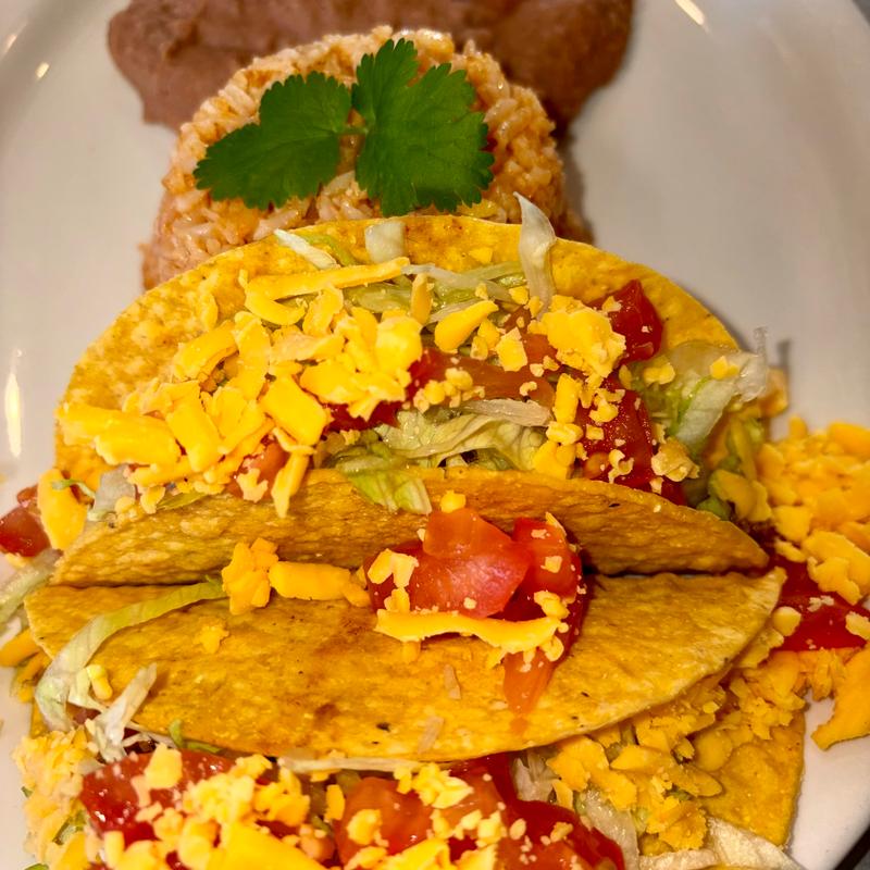 Two beef or chicken tacos (Crispy or soft) with lettuce, tomatoes and cheese.